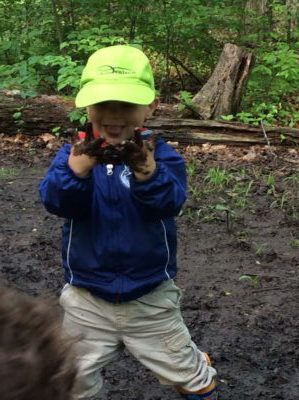 On May 26, 2017 during a visit to the local forest, we came across a large puddle of mud and spent the majority of our time exploring it; floating sticks, listening to the sound it made as we walked through it, observed how far the puddle splashed as we jumped, and what it felt like. In subsequent visits when we came upon the spot where the puddle was, the children looked for it and after noticing that it was gone we had meaningful discussions about it (rain vs. sun).